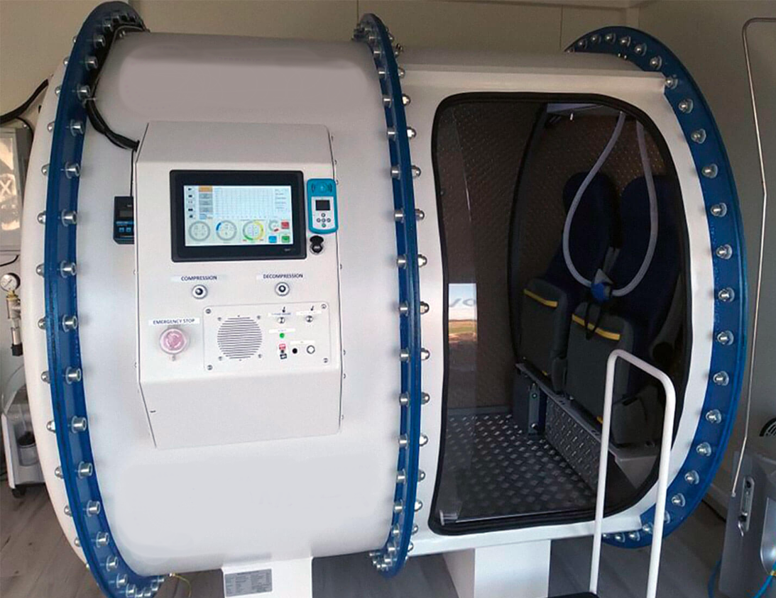 Inside, the chamber offers a clear-view sliding door, flexible seating configurations, and an intuitive touchscreen interface. The integrated UPS (Uninterrupted Power Supply) ensures safe depressurisation in the event of a power outage, and the BIBS oxygen delivery system supports reliable, high-concentration therapy.